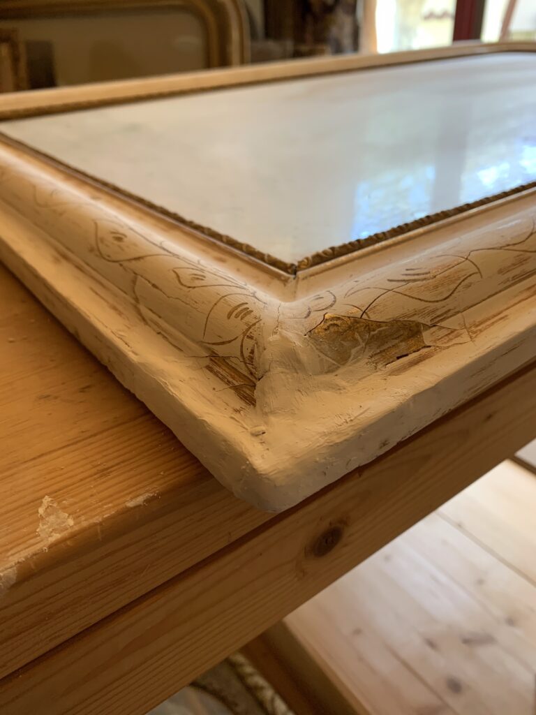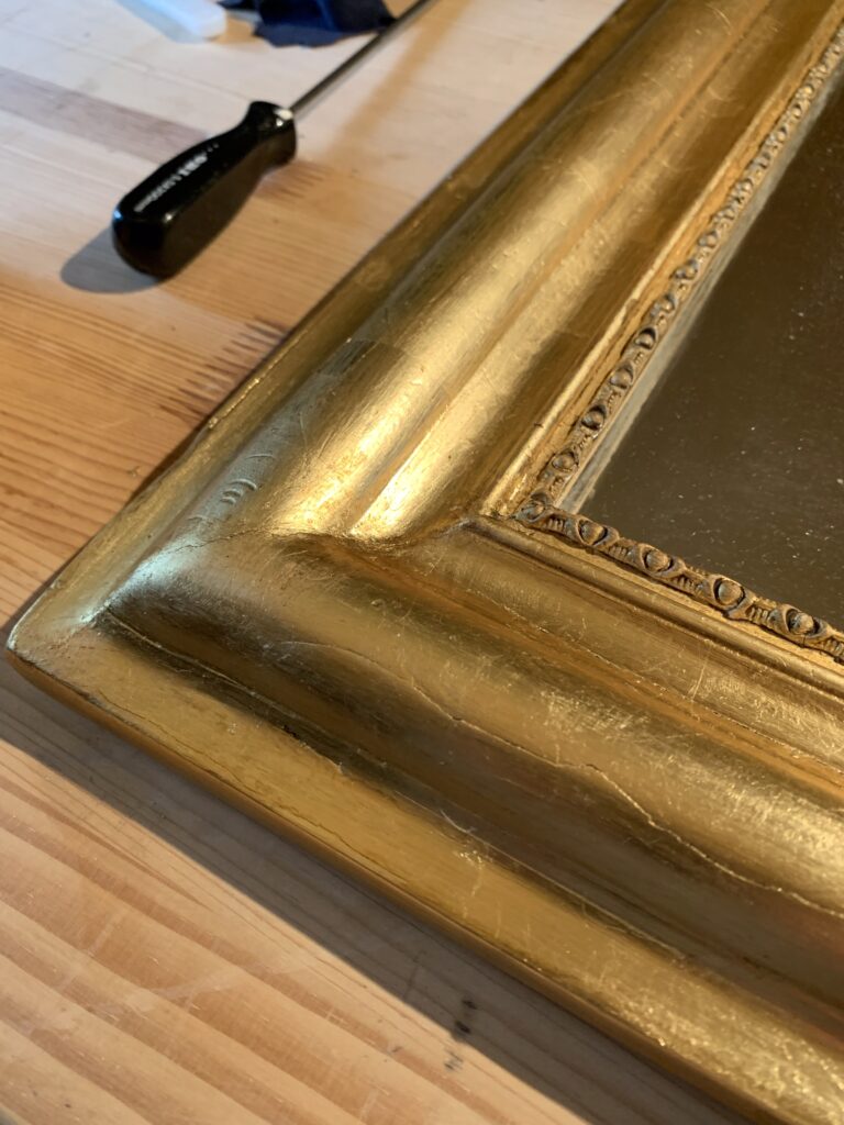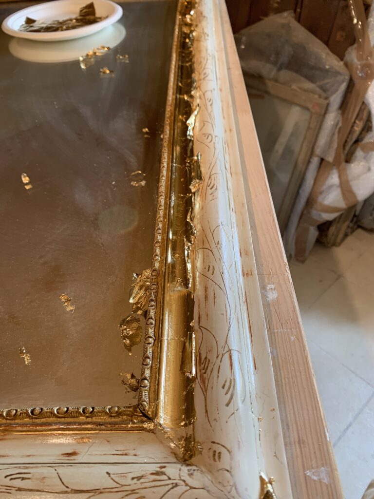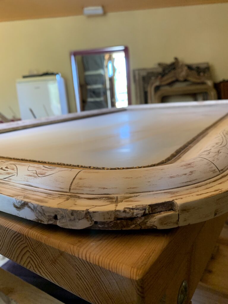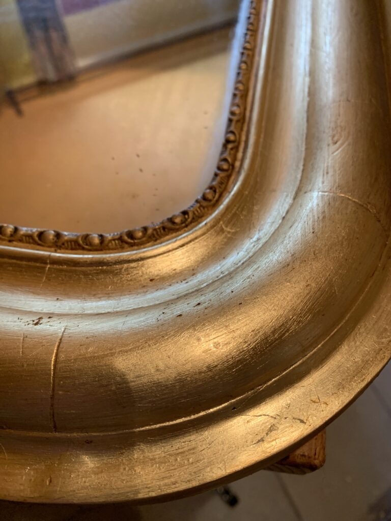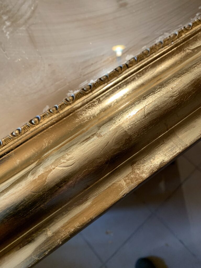 La restauration : l’ensemble du cadre a fait l’objet de reconstructions et de rebouchages, puis a été redoré à la feuille de cuivre jaune et protégé par un vernis.