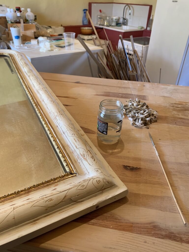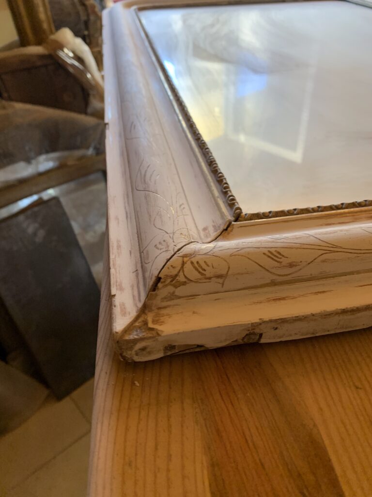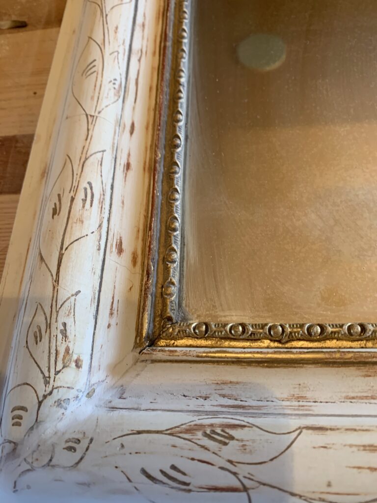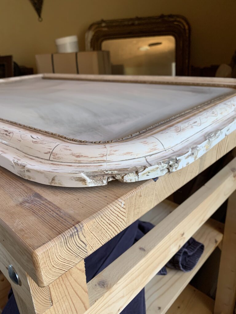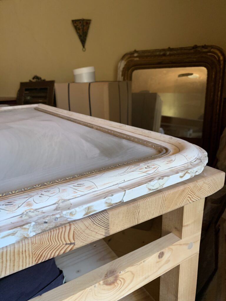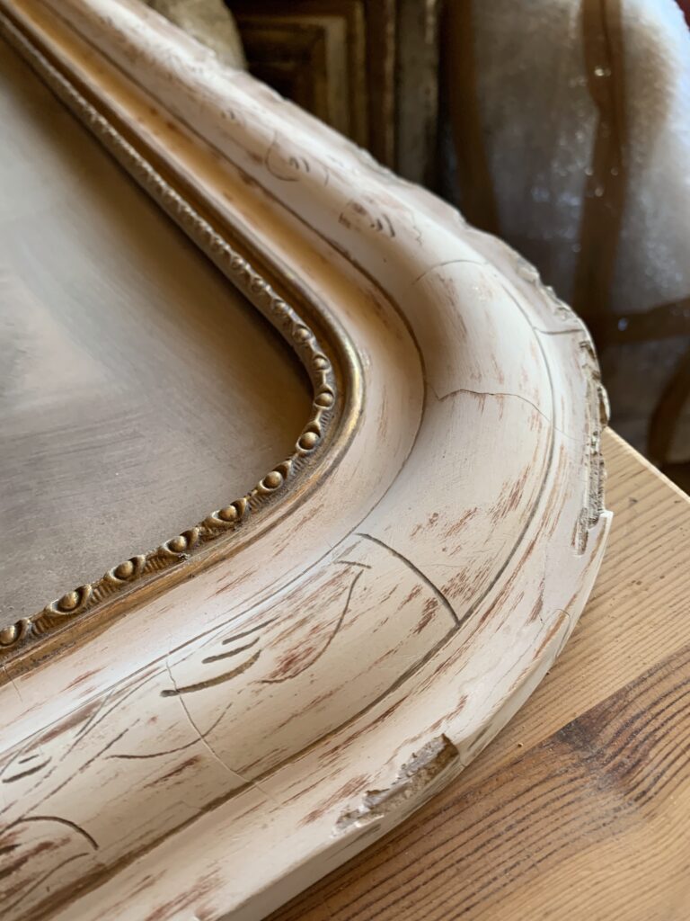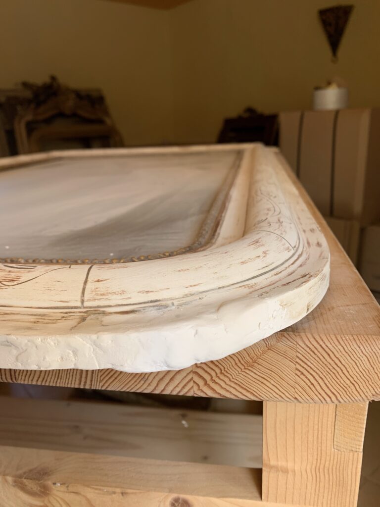 La restauration : l’ensemble du cadre a fait l’objet de reconstructions et de rebouchages, puis a été redoré à la feuille de cuivre jaune et protégé par un vernis.