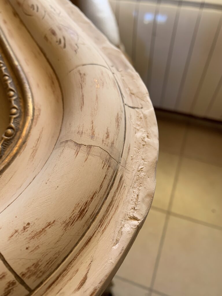 Ce qui a pu être conservé : la frise intérieure est tout ce qu’il reste du travail de l’artisan d’origine. L’or est d’origine et n’a fait l’objet d’aucune restauration. Elle à juste été nettoyée et vernie pour être protégée.